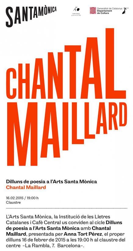 Lectura poética de Chantal Maillard a l’Arts Santa Mònica Publicat el 11 febrer 201518 Març 2016 per muriel Estáis tod@s convocad@s a la lectura que dará Chantal el lunes 16 de febrero a las 19:00 al claustro del centro. La presentación del acto irá a cargo de Anna Tort Pérez. Centre d’Arts Santa Mònica, la Rambla, 7. Barcelona Compartir: Share on X (S'obre en una nova finestra) X Email a link to a friend (S'obre en una nova finestra) Correu electrònic Imprimeix (S'obre en una nova finestra) Imprimeix Comparteix al Facebook (S'obre en una nova finestra) Facebook Share on Pinterest (S'obre en una nova finestra) Pinterest M'agrada S'està carregant... Relacionats