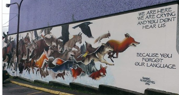 Imagen: Mural pintado por Dedos y su mujer Xochiti, un duo artístico de nombre Nomadic Alternatives, en una pared en East Village o East Handings, en Vancouver. El texto dice lo siguiente: “Estamos aquí / estamos gritando, llorando / y no nos oís / porque habéis olvidado / nuestro lenguaje”.