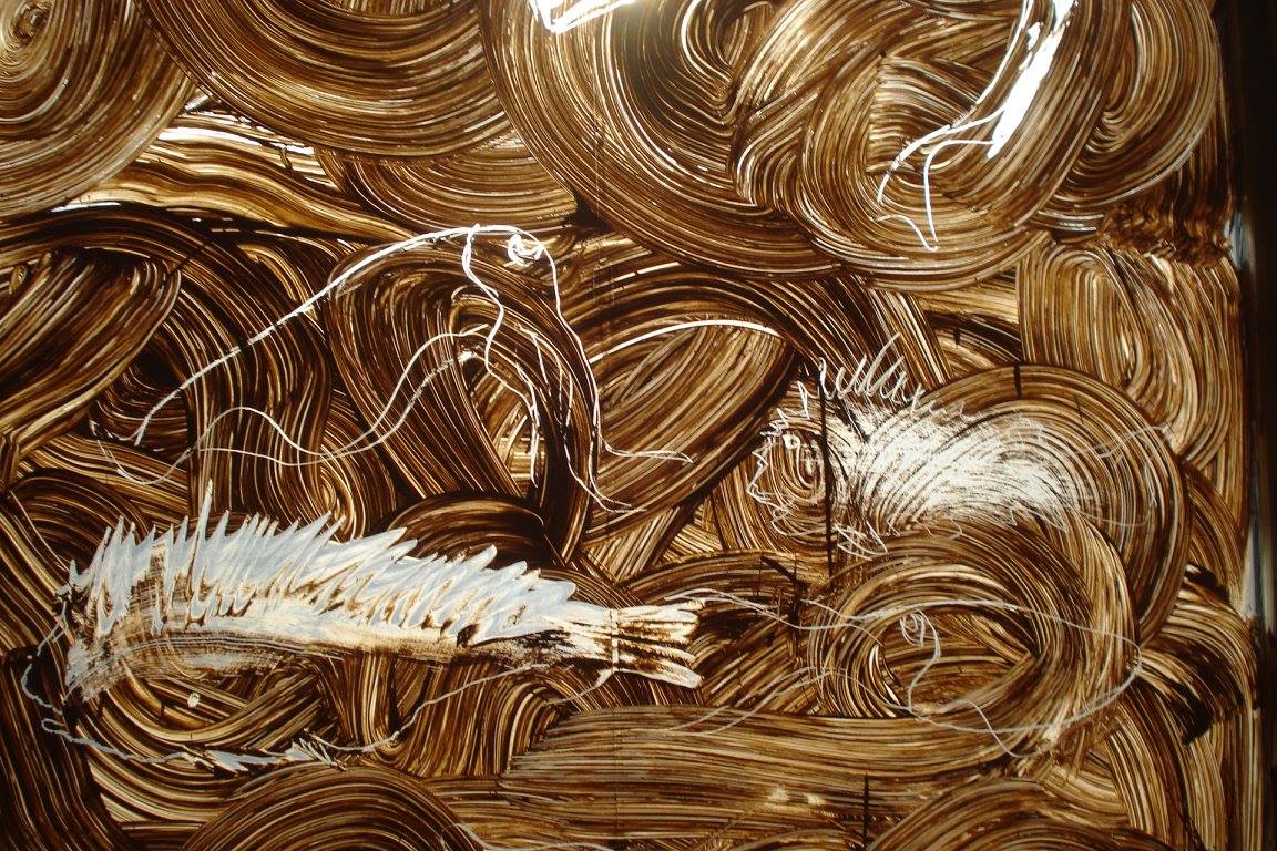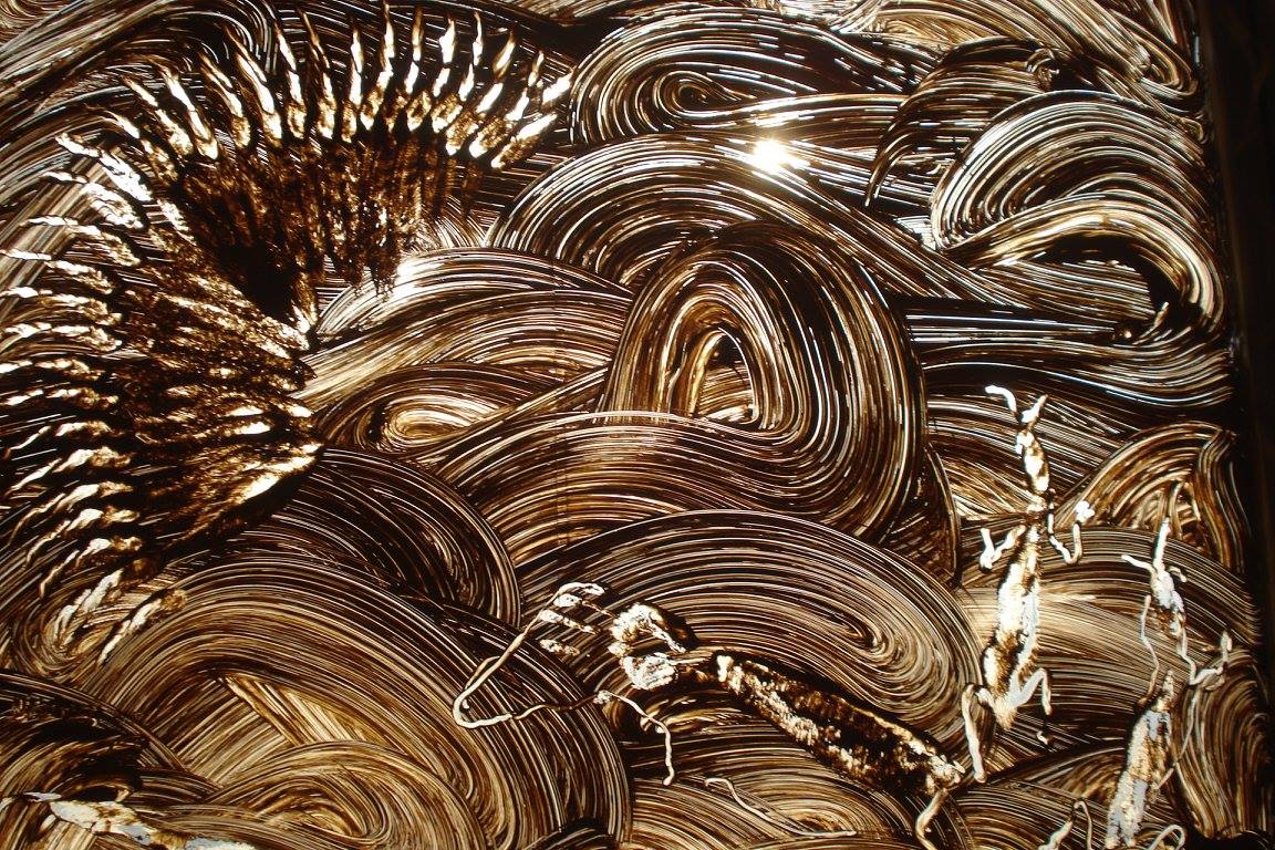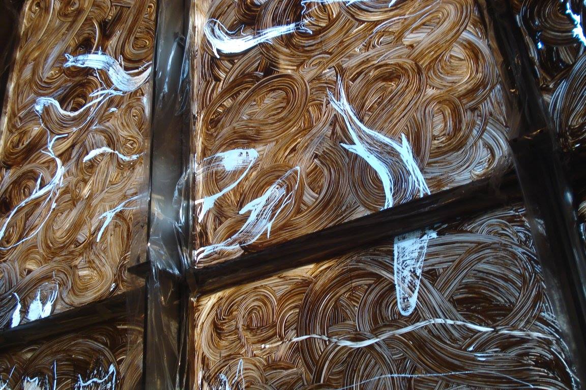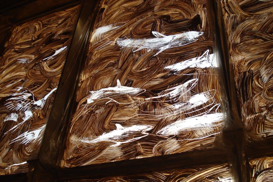 “Es arcilla sobre cristal, y la cosa es que el sol atravesando la cristalera proyecta imágenes en el suelo y sobre la gente (…), lo que me gusta es cómo la arcilla se vuelve pintura y luz en movimiento“, subrayó Barceló en el acto inaugural.